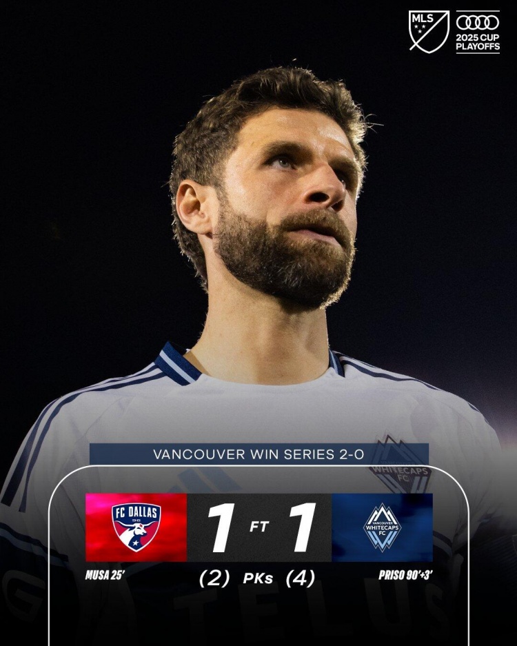 11月2日讯 在好意思职联季后赛第二场,温哥华白浪1-1战平达拉斯FC,过程点球大战温哥华白浪4-2胜利晋级下一轮。