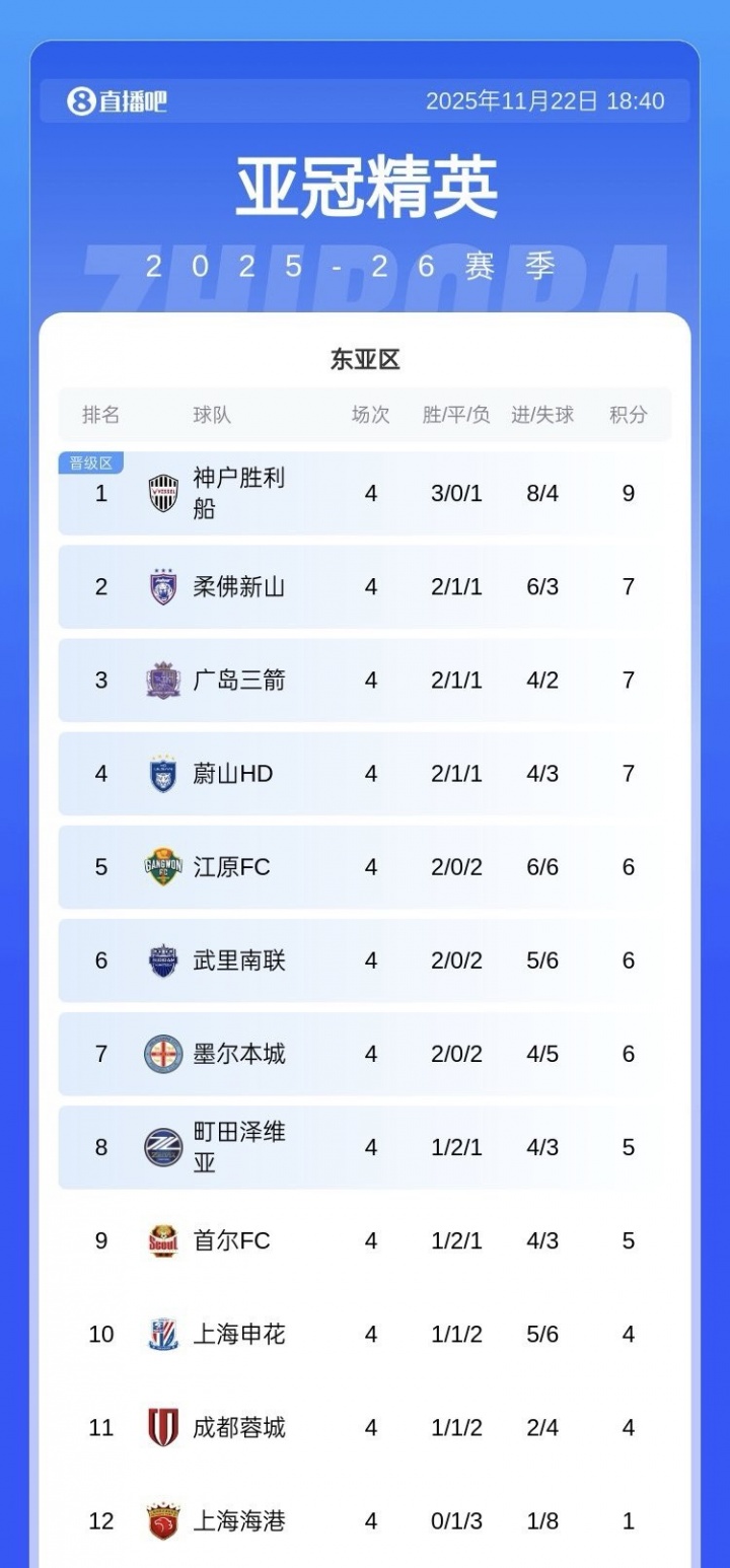亚冠精英联赛:1胜1平2负积4分,排东亚区倒数第2