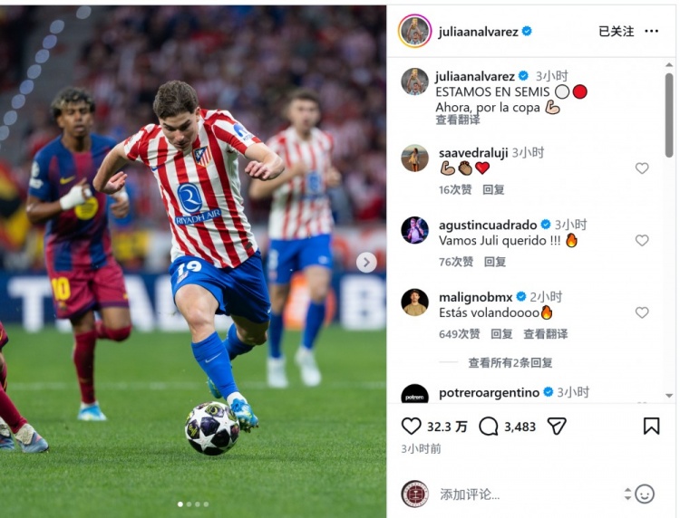 阿尔瓦雷斯社媒晒出赛事 照片,庆祝球队晋级下一轮 ,配文:“我们晋级下一轮 欧冠准总决赛 ,现在要冲击国王杯第一名 !”