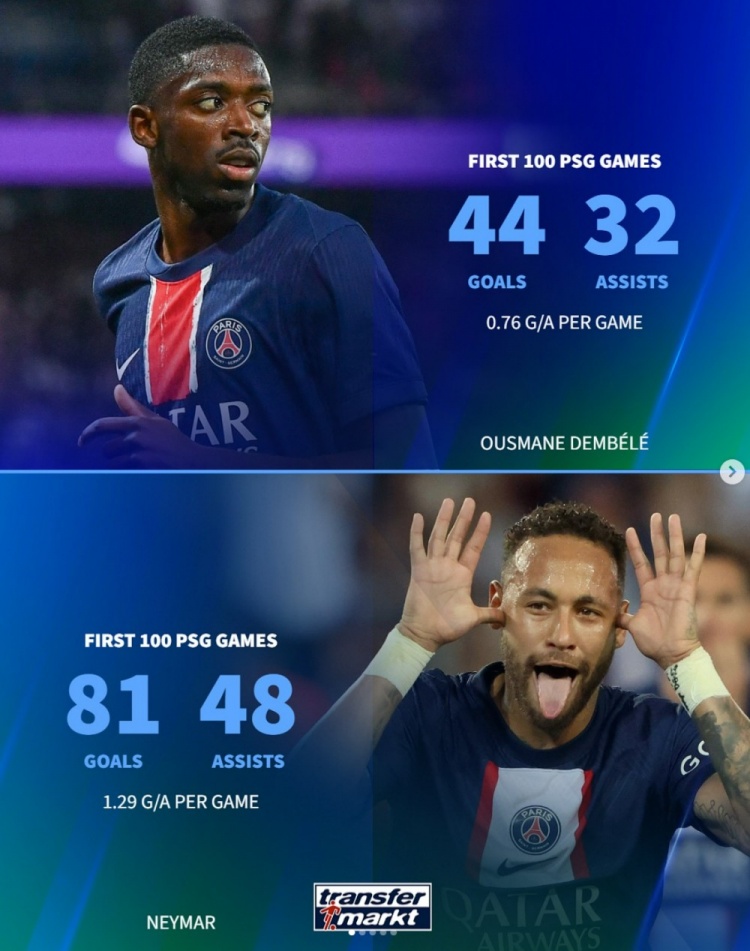 10月22日讯 在本轮欧冠巴黎7-2打败勒沃库森的比赛中,登贝莱迎来巴黎糊口100场里程碑,德转也对比了登贝莱与内马尔、伊布、姆巴佩等东说念主在巴黎前100场参与进球数据: