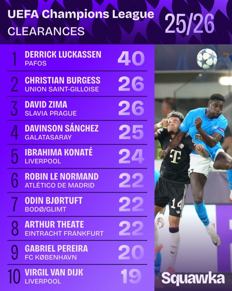 10月23日讯 本赛季欧冠联赛阶段已战罢3轮,Squawka统计了到当今死亡的突围榜单。帕福斯后卫卢卡森40次突围断崖式迥殊,圣吉罗斯后卫布尔格斯和布拉格斯拉维亚后卫皆玛26次分列二三位。