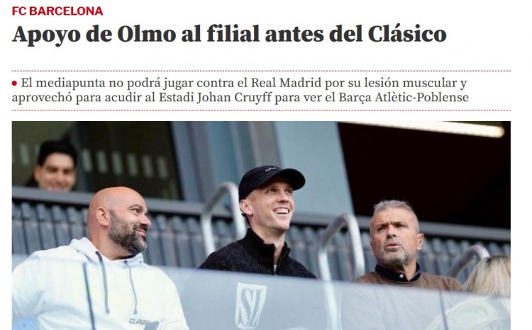据悉,奥尔莫是在上一个国度队比赛日历间左腿比目鱼肌肌肉受伤,距离复出尚需时日。诓骗留在巴塞罗那的契机,奥尔莫在本周日赶赴约翰-克鲁伊夫球场,现场不雅看了巴萨B队的比赛。