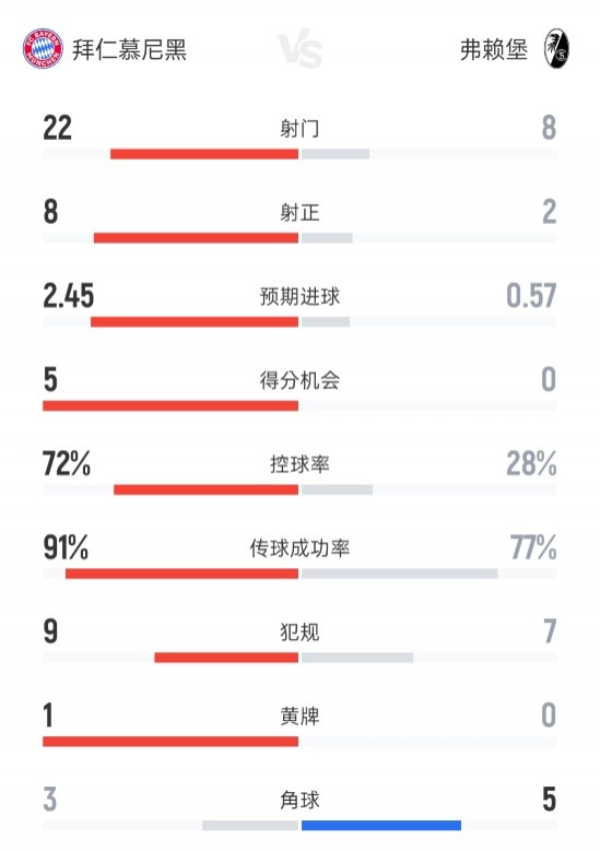 11月23日讯 2025-26赛季德甲联赛第11轮,拜仁6-2大捷弗赖堡。