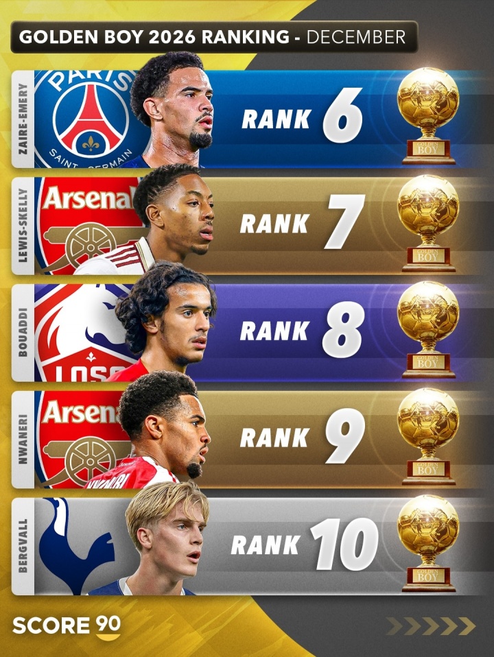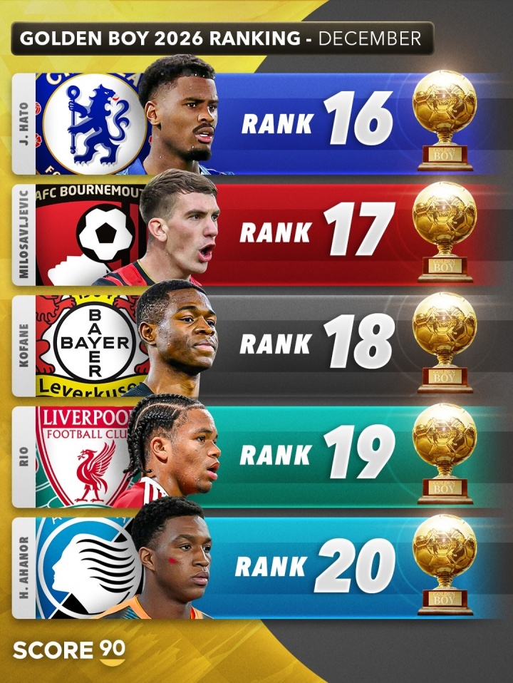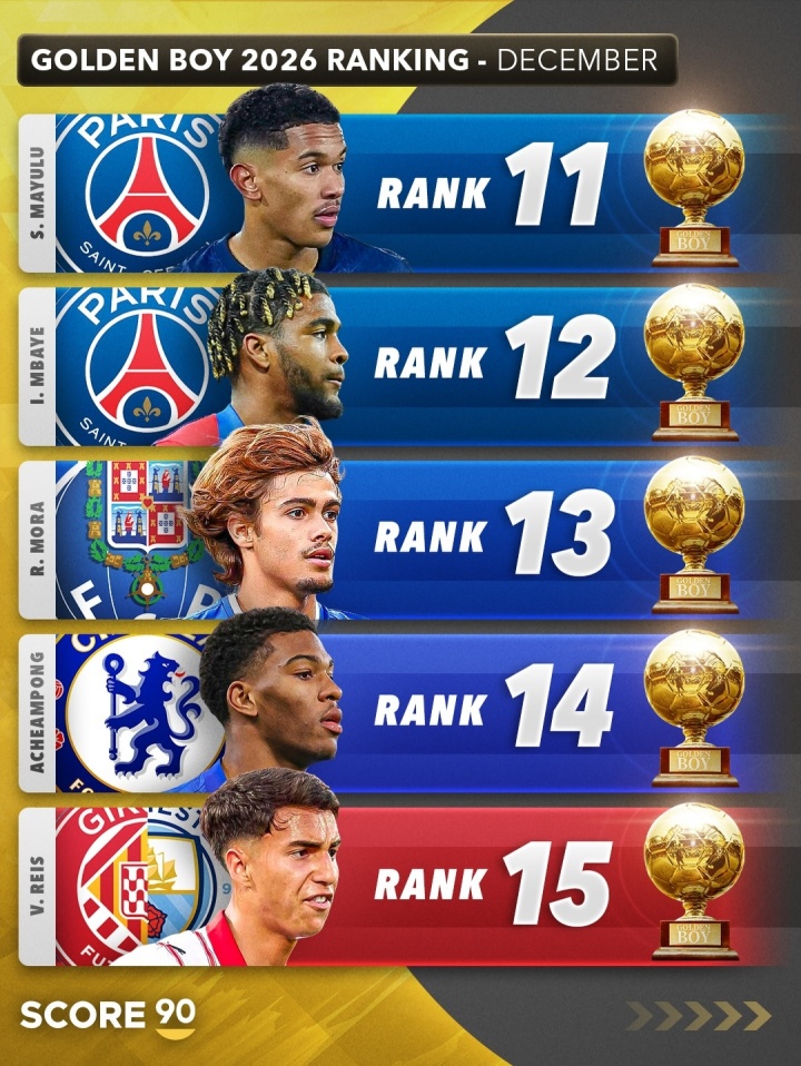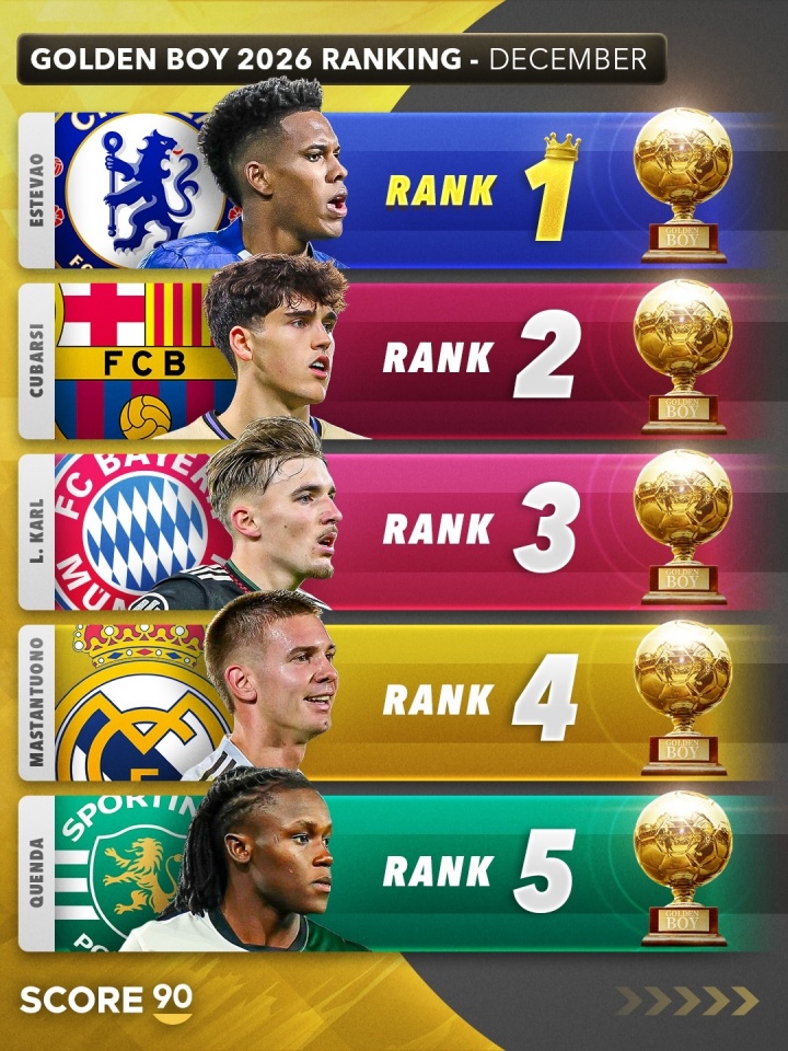 12月04日讯 Score90列出了2026年金童名次瞻望,埃斯特旺居首,库巴西、卡尔分列二三。