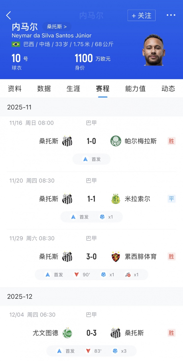 12月04日讯 自11月11日,内马尔在社媒单发了一张科比的经典技艺相片,随后在代表桑托斯的4场比赛里,球队战绩3胜1平,个东说念主孝顺5球1助。