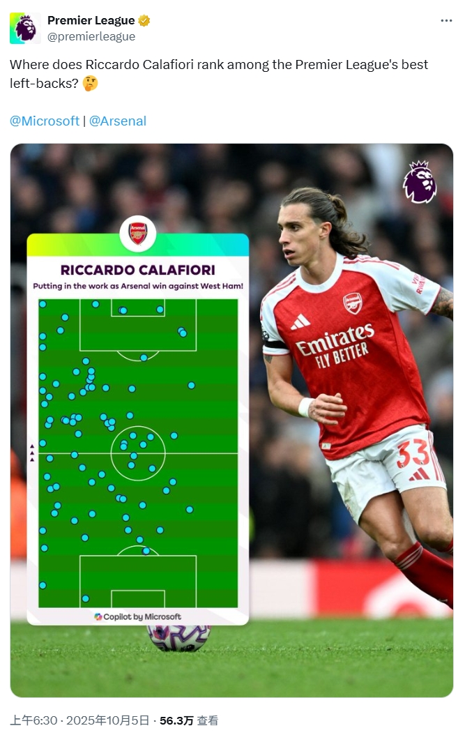 英超官方赛后晒出了卡拉菲奥里的触点图,并提问:卡拉菲奥里在英超最好左后卫排行第几?