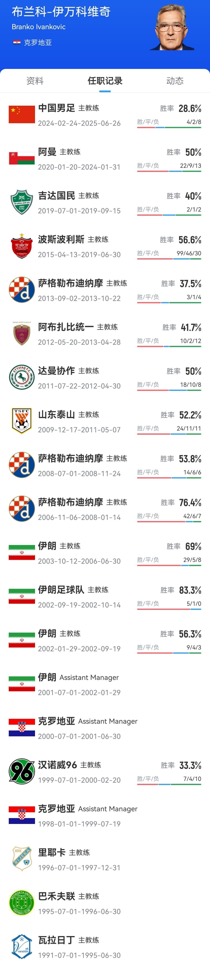 2024年2月24日,伊万出任中国男足主帅,2025年6月27日下课,时间共带队默契比赛14场,战绩为4胜2平8负。其中叶初赛36强赛国足1胜2平1负“躺进”18强赛,18强赛国足3胜7负进7球丢20球,提前1轮无缘2026好意思加墨宇宙杯。国足也成为伊万合手教糊口的终末一站。