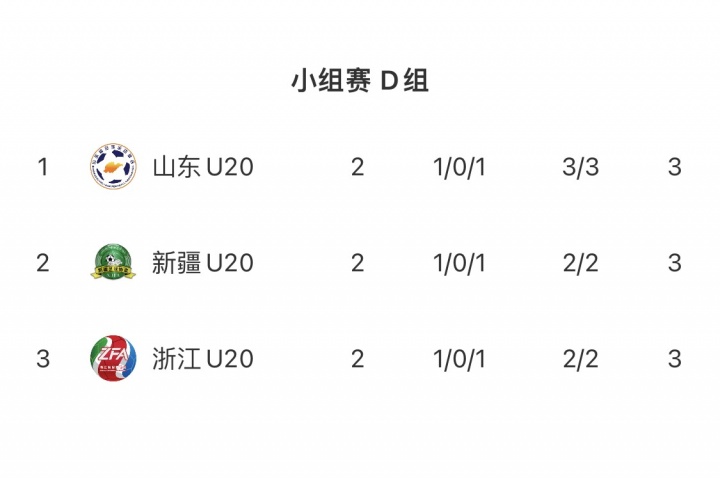 昨日男足U20的D组末轮较量鸿沟后,山东、浙江、新疆三队同积3分,山东U20队凭借进球数上风(3球)最初出线。