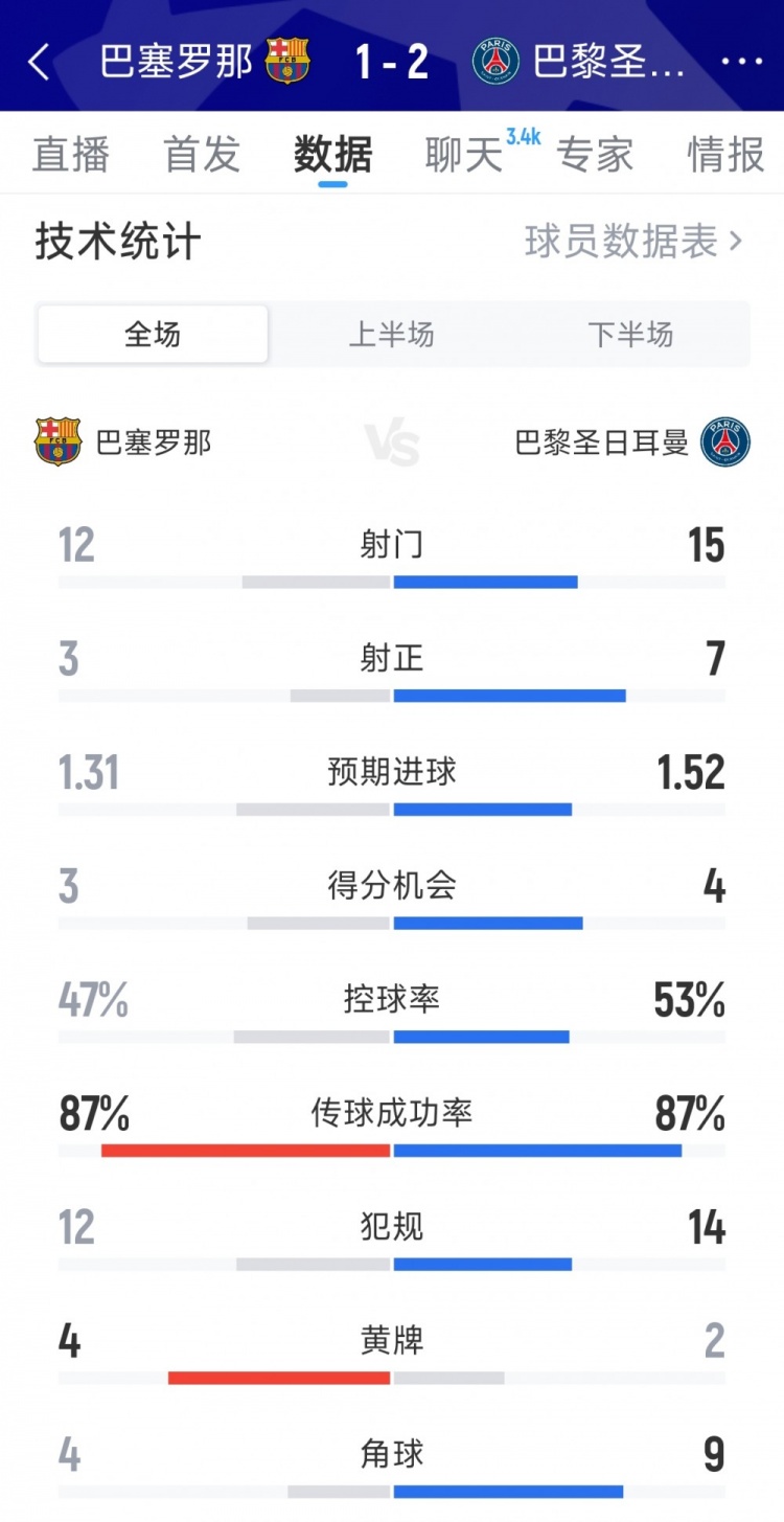 10月2日讯 在本轮欧冠,巴黎2-1打败巴萨。以下为两边全场数据对比: