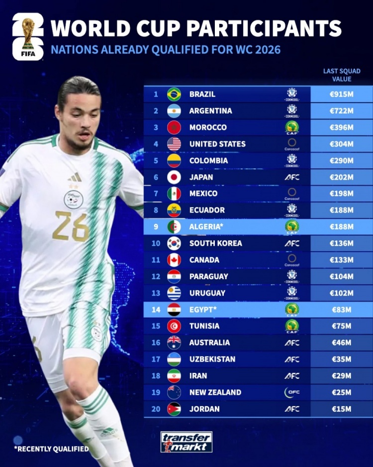 10月10日讯 德国转会阛阓统计了获取2026年全国杯参赛履历球队的球员身价(上期名单之中的球员),比肩出榜单,巴西居首,阿根廷次席。