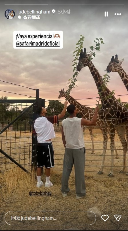 10月13日讯 由于肩伤未愈,贝林厄姆莫得入选本次国外比赛日英格兰队大名单。在马德里,他得以获取不毛的闲逸时光。在外交媒体上,他晒出了我方在动物园内和长颈鹿互动的像片。