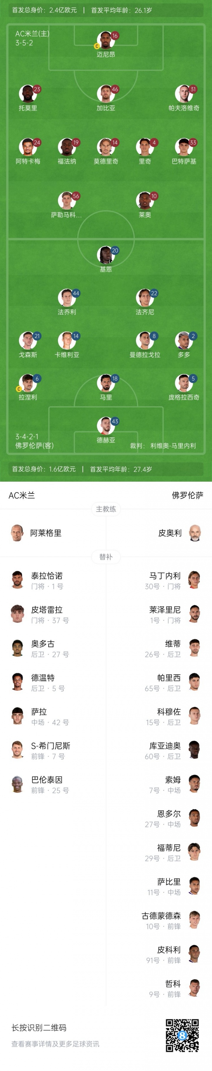 米兰首发:16-迈尼昂、23-托莫里、46-加比亚、31-帕夫洛维奇、24-阿特卡梅、19-福法纳、14-莫德里奇、4-里奇、33-巴特萨基、56-萨勒马科尔斯、10-莱奥