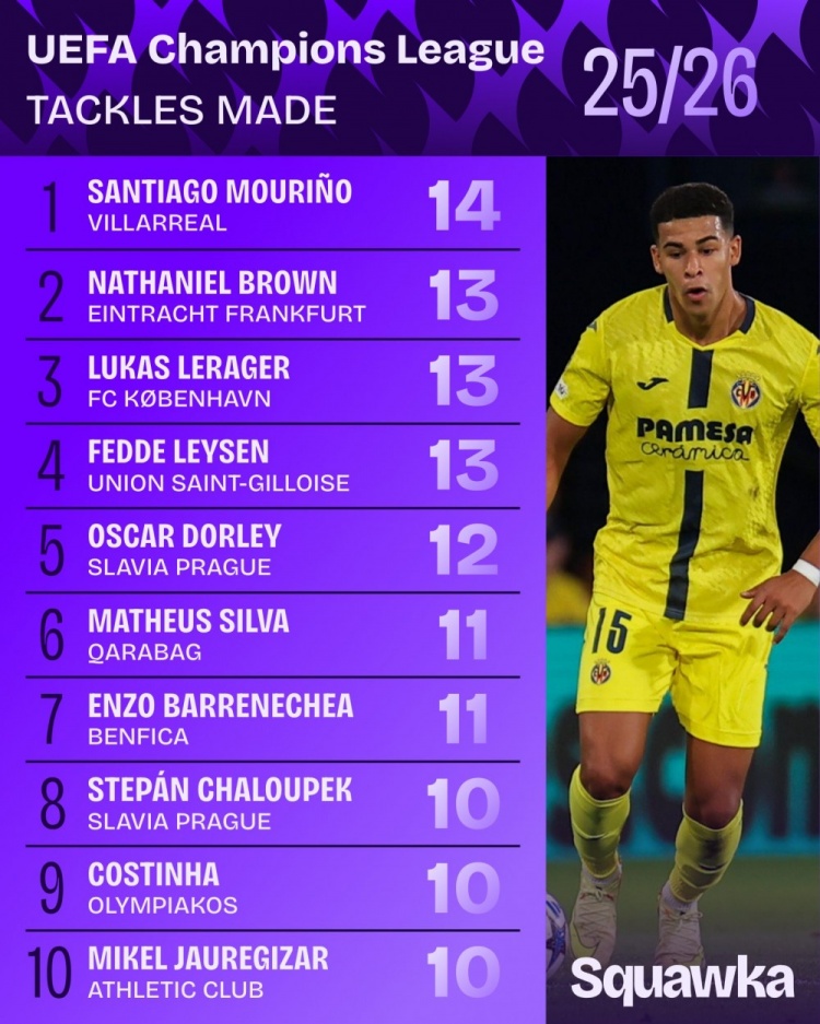 10月23日讯 本赛季欧冠联赛阶段已战罢3轮,Squawka统计了到当今收场的铲球榜单,比利亚雷亚此后卫圣地亚哥-穆里尼奥14瓜代一,法兰克福后卫布朗等三东说念主13次分列二至四位。