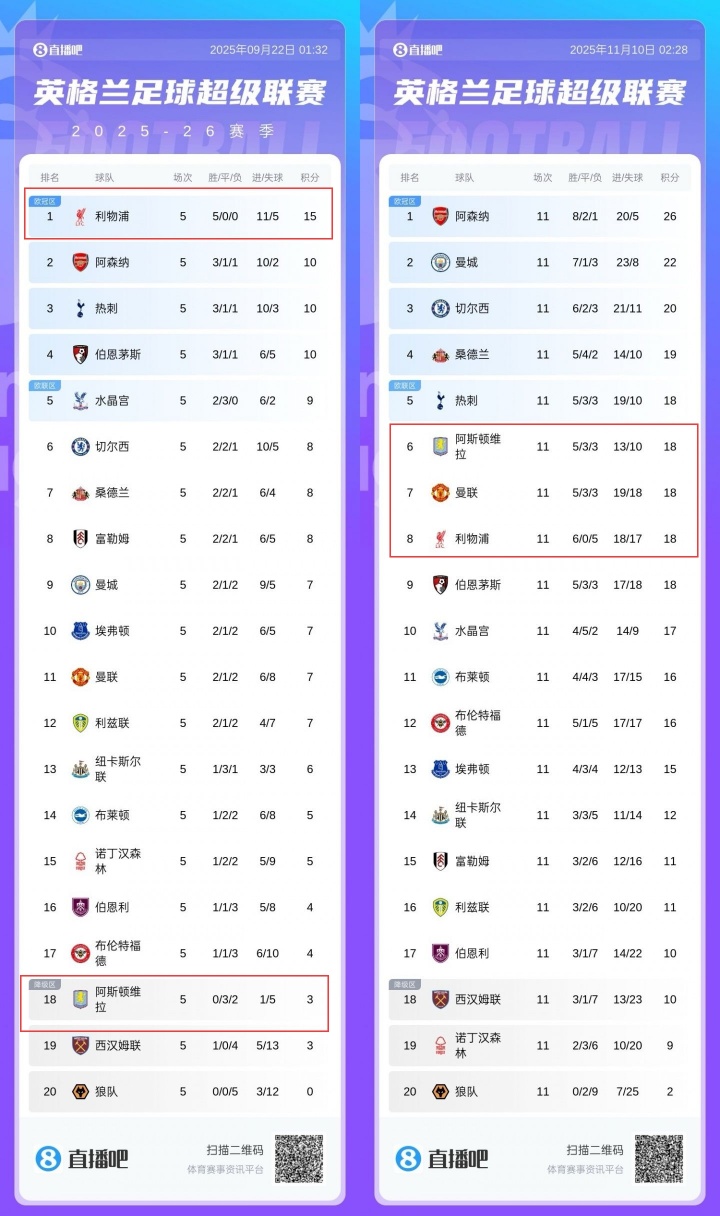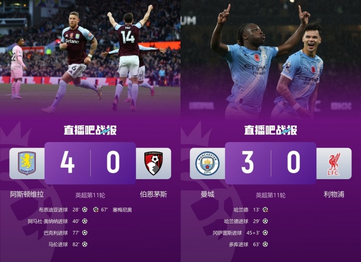 阿斯顿维拉本轮4-0大捷伯恩茅斯,近6轮5胜1负,豪取15分,积分从第18名暴涨至英超第6。