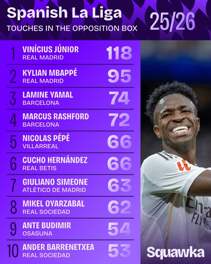 11月12日讯 本赛季西甲进行了12轮比赛,Squawka统计了在对方禁区内触球次数榜,维尼修斯118次居首,姆巴佩、亚马尔二三位。