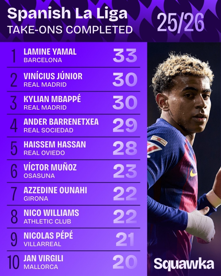 11月12日讯 巴萨亚马尔、皇马的姆巴佩和维尼修斯,他们在过东说念主防碍方面,王人有着超卓的天禀。在2025-26赛季西甲联赛中,据Squawka数据统计,亚马尔在过东说念主次数排名榜单居首。