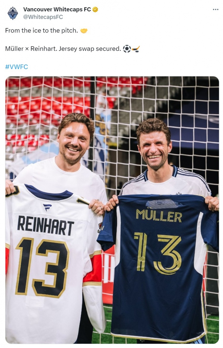 穆勒与效用于NHL佛罗里达好意思洲豹的加拿大冰球畅通员莱因哈特碰面,并互换球衣,温哥华白浪社媒晒出两东说念主的合照,配文:“从冰场到球场,穆勒X莱因哈特,互换球衣。”