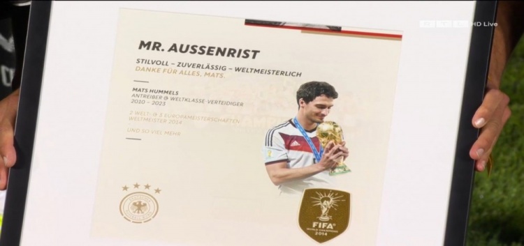 德国足协向其施舍了印有胡梅尔斯手捧鼎力神杯的感谢信,其施手脚:
