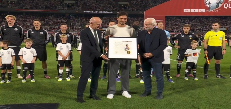 9月8日讯 德国队在本轮世初赛主场迎战北爱尔兰,主队赛前为退役的宿将胡梅尔斯举办了问候庆典。
