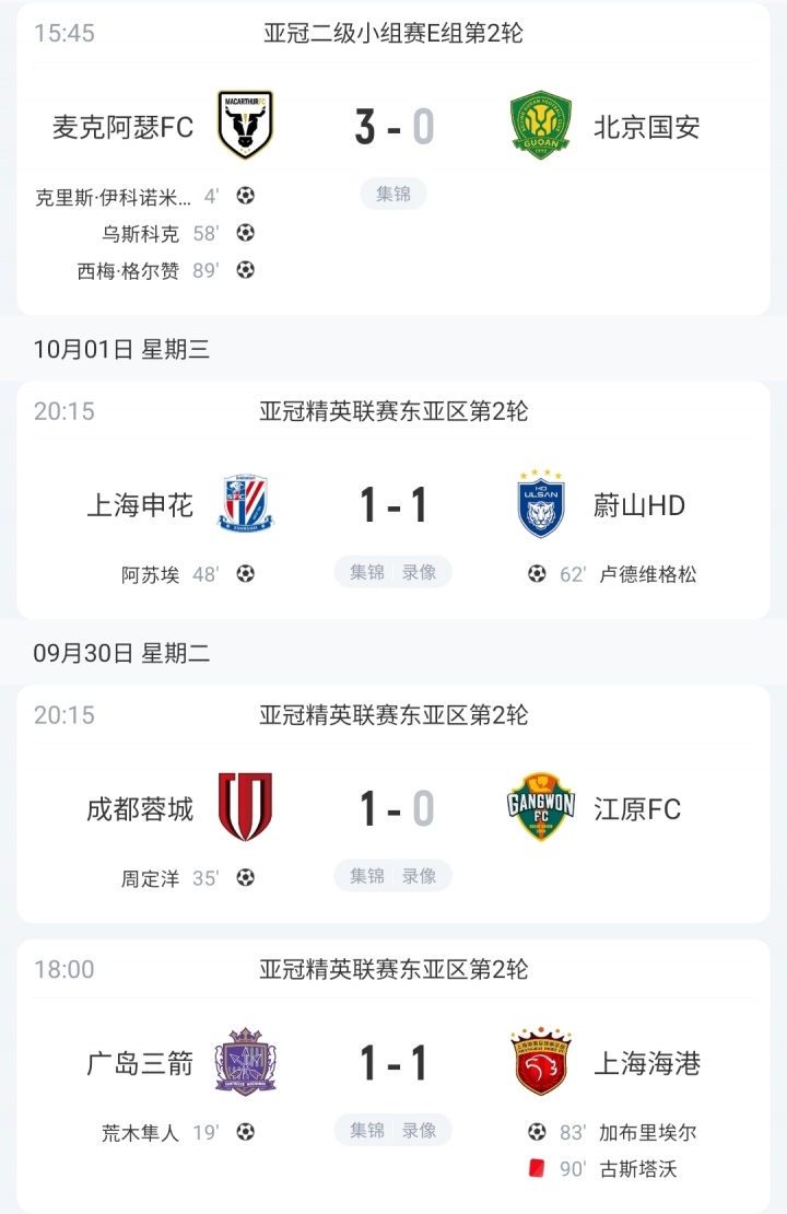 10月02日讯 亚冠二级联赛第二轮,北京国安客场0-3不敌麦克阿瑟FC。亚冠精英联赛/二级联赛第2轮,中超球队获得1胜2平1负的战绩,4支球队总战绩来到1胜3平4负。
