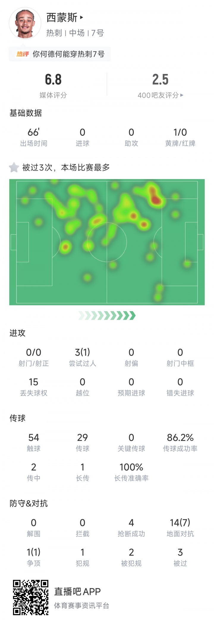 22岁的西蒙斯昨晚第7分钟替补登场,换下脑颤动的贝里瓦尔。然而他出战66分钟清楚欠安,被过3次+15次丢球权,传球顺利率86.2%。在第73分钟他被换下。