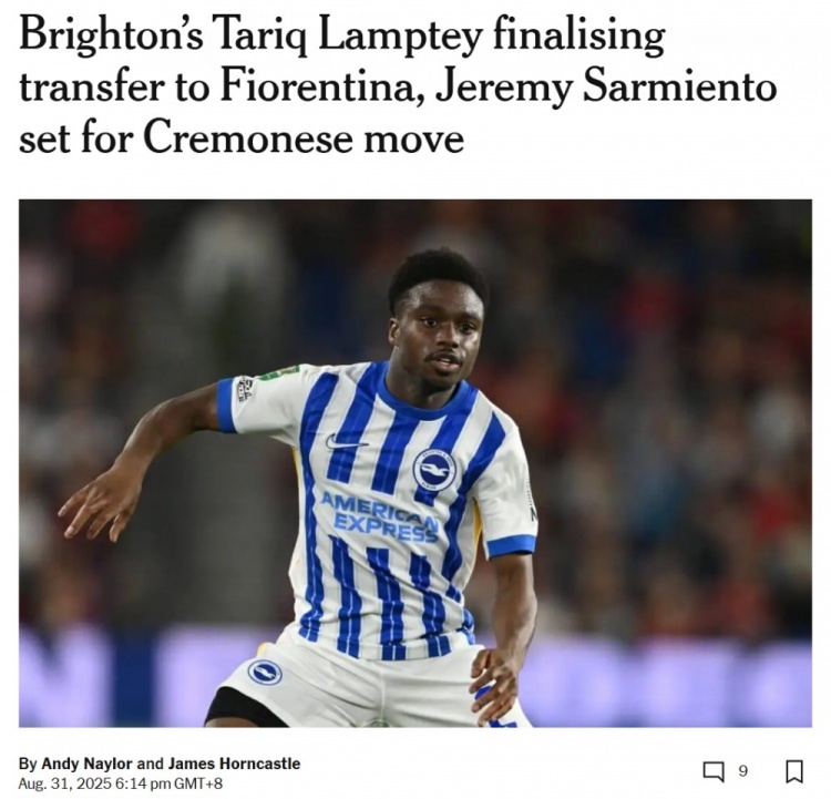 8月31日讯 TA报谈,布莱顿两名球员兰普泰以及萨米恩托将转会意甲,分裂去往佛罗伦萨以及克雷莫内塞。