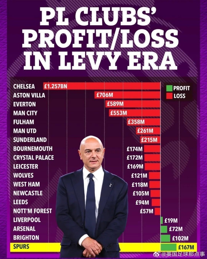 【盈利第一】英超俱乐部在列维期间的盈亏榜:热刺盈利1.67亿镑,排行英超第一!💰