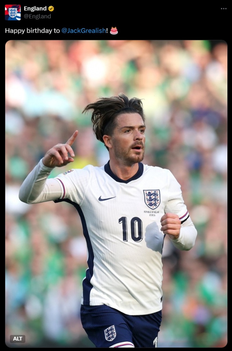 9月10日讯 格拉利什当天迎来30岁诞辰,英格兰队官方社媒为其奉上诞辰祝颂。